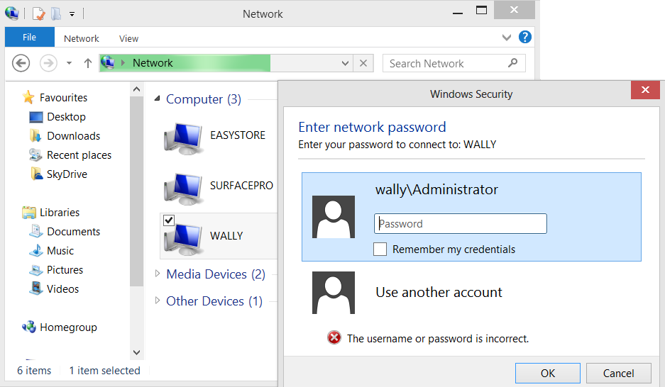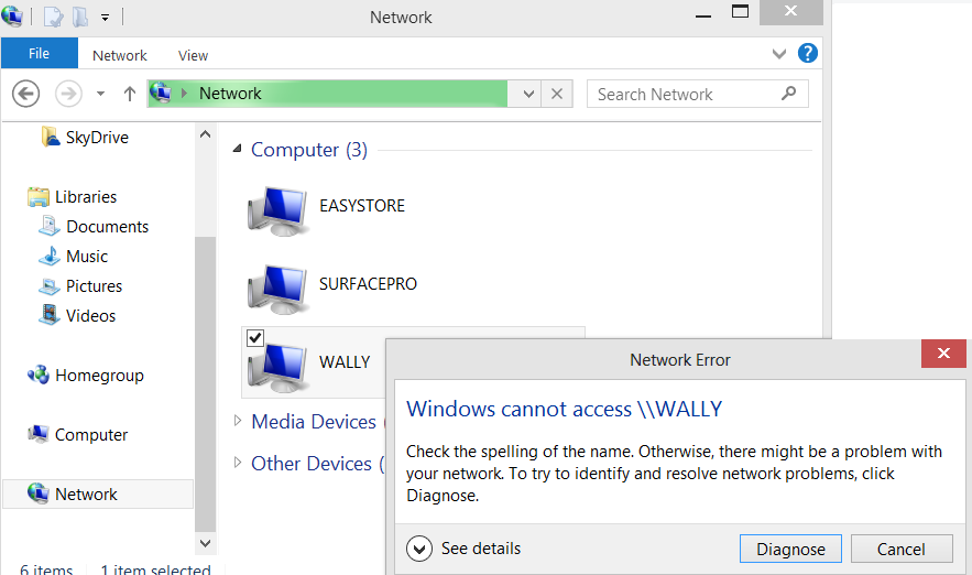 Initially, trying to access the Surface RT (its computer name is Wally) does not work as you can see on the screenshot.