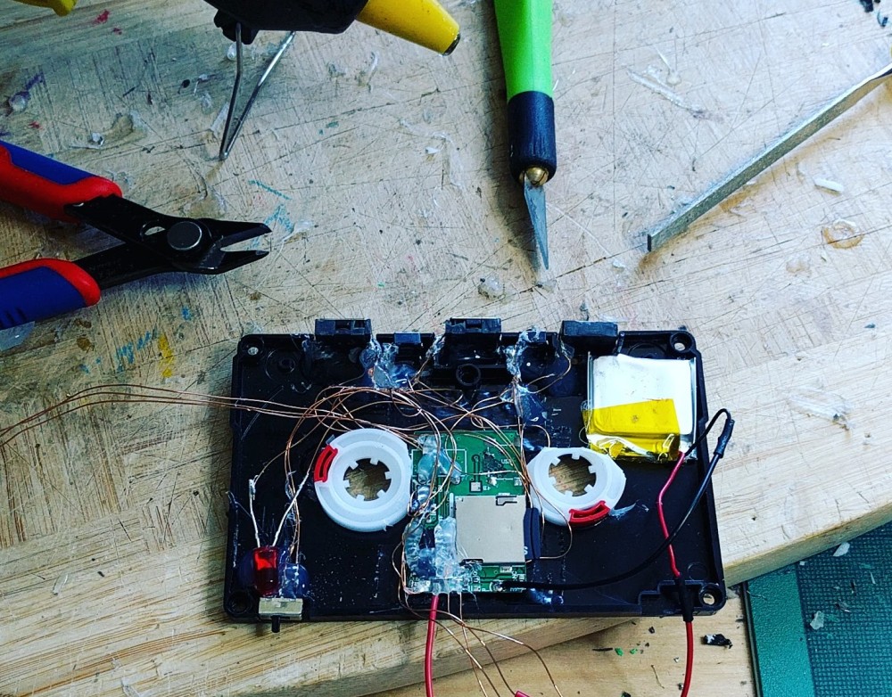 Having checked that everything still worked, I hot glued the reassembled MP3 player into the disembowelled cassette tape case.