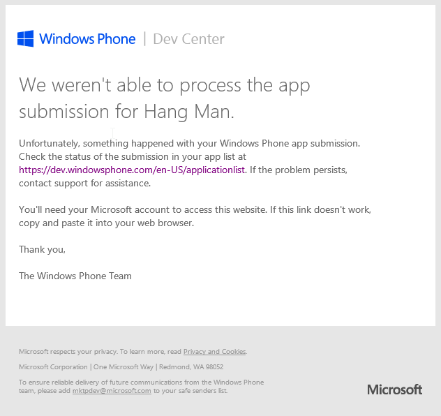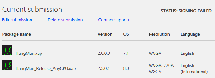 After having pushed a small update to my Window Phone App Hang Man, I received this dreaded Email, stating that the submission of the app has failed.