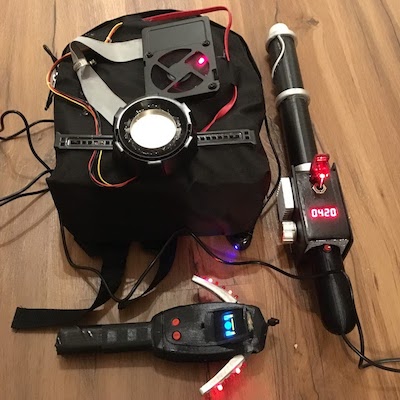 I designed, 3D-printed, soldered and programmed a proton wand like in the Ghostbusters movies and cartoons for my kids.